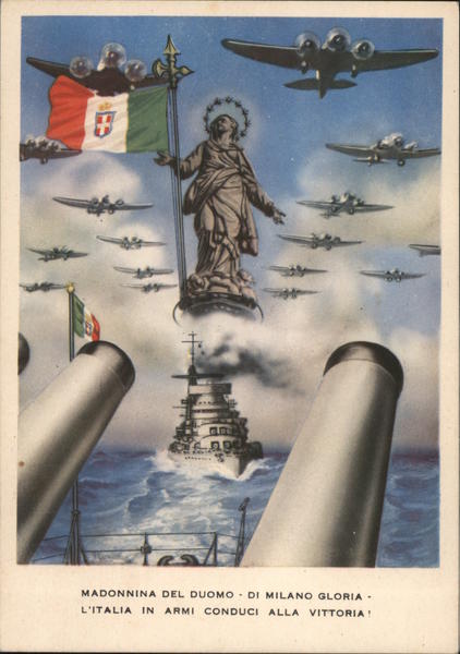 Front: MADONNINA DEL DUOMO - DI MILANO GLORIA - L'ITALIA IN ARMI CONDUCI ALLA VITTORIA ! Back: VINCERE! 1003 Edizioni P. E.C.O. - Milano - via G. Modena, 27 - Anno X X E. F. - Riprod. vietata
