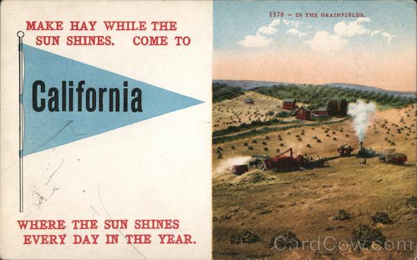 Front: 1578 IN THE GRAINFIELDS. MAKE HAY WHILE THE SUN SHINES. COME TO California WHERE THE SUN SHINES EVERY DAY IN THE YEAR. Back: FOREIGN 20 BY SOUVENIR PUBLISHING CO. SAN FRANCISCO