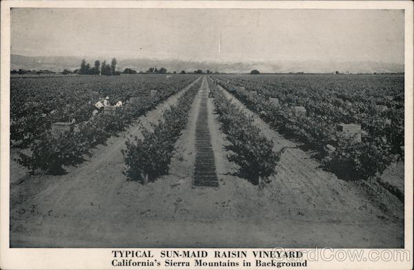 TYPICAL SUN-MAID RAISIN VINEYARD California's Sierra Mountains in Background