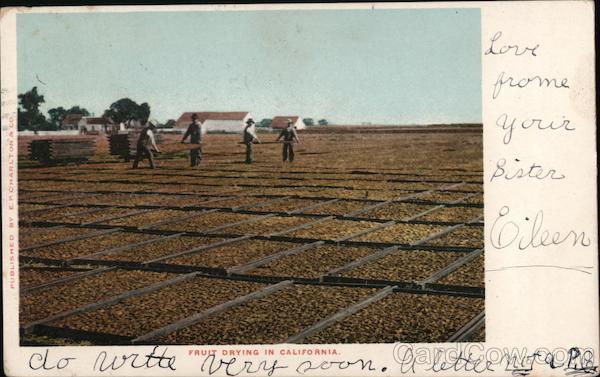 Front: Love frome Yorur sister PUBLISHED BY E. P. CHARLTON & Co. Eileen FRUIT DRYING IN CALIFORNIA. Back: • MV SINKONO 0621NITINVHA 9021 JOSIALIS ONLINE PARA MARTS Post Carrer det SAN 4302 1908 AEG 1908 • XPM CAL A. J. Leonard Santa Clara Bollege ga