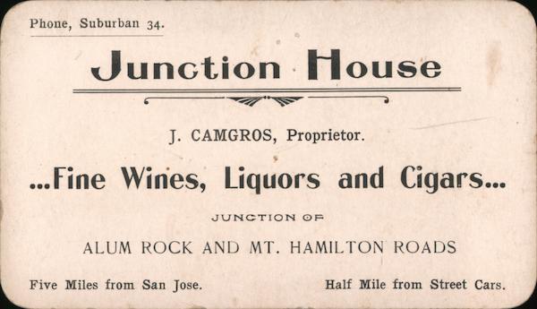 Phone, Suburban 34. Junction House J. CAMGROS, Proprietor. ...Fine Wines, Liquors and Cigars... JUNCTION OF ALUM ROCK AND MT. HAMILTON ROADS Five Miles from San Jose. Half Mile from Street Cars.