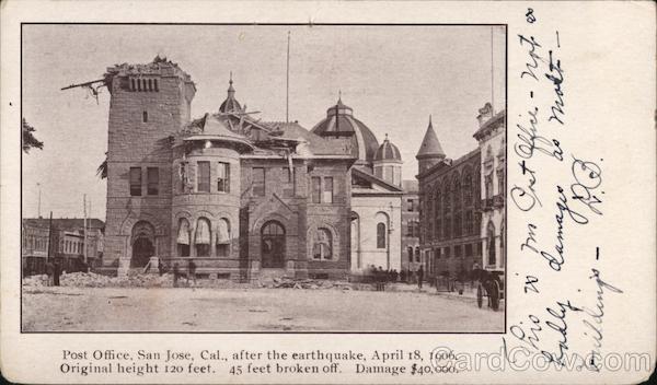 Front: 18 Office - not as motte- Gret ene al Buildings Endly damages Post Office, San Jose, Cal., after the earthquake, April 18, 1906. Original height 120 feet. 45 feet broken off. Damage $40,000. Back: 3. FJ POSTAL