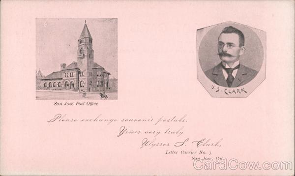 Front: ILIO ርርርር - 2010 U.S. CLARK San Jose Post Office Please exchange souvenir prostats. Yours very truly Illyuses S. Clark, Letter Carrier No. 3 San Jose, Cal. Back: 125- POSTAL 2250