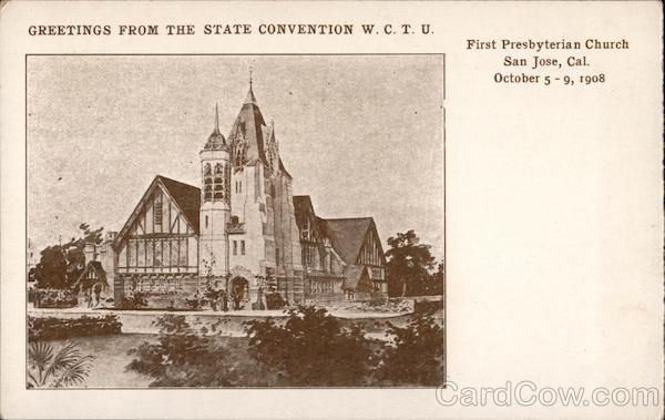 Front: GREETINGS FROM THE STATE CONVENTION W. C. T. U. First Presbyterian Church San Jose, Cal. October 5 -9, 1908 %3D Back: POSTAL THIS SPACE FOR CORRESPONDENCE.