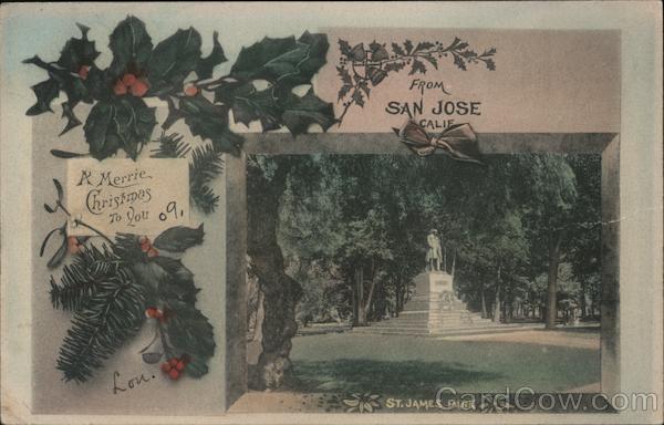 Front: SAN JOSE CALIF A Merrie Christmes To You 9, Lon. ST. JAMES PARK Back: 15 - JOSE 9-PM 1909 -bou- With Published by Richard Behrendt, San Francisco, Cal. Best Wishes. Miss Gladys Robinson, Portland, Oregon Williams Ave, ( Albina)