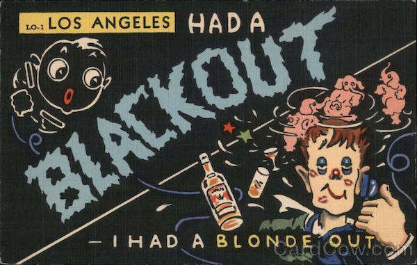 Front: LO. LOS ANGELES HAD A BLACKO -THAD A BLONDE OUT Back: WESTERN PUBLISHING & NOVELTY CO., LOS ANGELES, CALIF. "C.T.ART-COLORTONE'' REG. U.S. PAT. OFF. POST CARD 2 B-H694 HERE STAMP ONE CENT PLACE