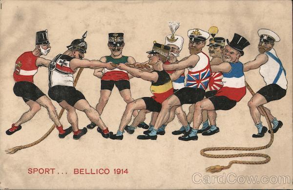 Six world leaders playing tug of war with two world leaders as one world leader watches.