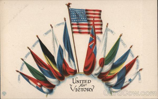 Front: CUBA, PORTUGALO SEBE -- BELGIUM RUSSIA FRAN Victory UNITED ANPAN ROUMANIA LUONTENEGRO ARANAMA S Back: © Mustrated Postal Card & Nov. Co. N. Y. O awat CORRESPONDENCE. POST CARD POST CARD ADDRESS STAMP HERE PLACE POSTAGE PRINTED IN THE U.S.A.