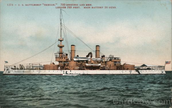 Front: 93 1274 U. S. BATTLESHIP "OREGON." 700 OFFICERS AND MEN. LENGTH 348 FEET. MAIN BATTERY 16 GUNS. Back: 5- EDWARD HMITCHELL. PUBLISHER, SAN FRANCISCO.