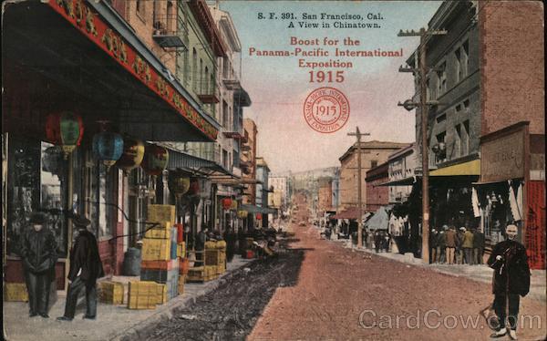 Front: S. F. 391. San Francisco, Cal. A View in Chinatown. Boost for the Panama-Pacific International 1915 INTERN 1915 PXPOSTION GLT EDGE RMTIONAL Back: DOMESTIC: POST ARD 10-
