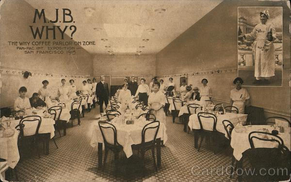 Front: M.J.B. WHY? THE WHY COFFEE PARLOR ON ZONE PAN-PAC.INT. EXPOSITION SAN FRANCISCO 1915 WH aim Back: 10 DD CARDINELL VINCENT CO. MFG. SAN FRANCISCO