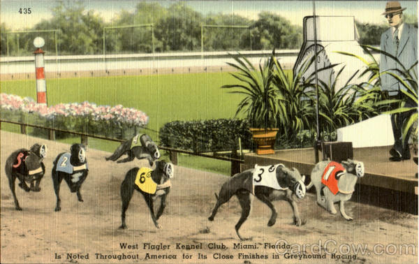 Is Noted Throughout American for Its Close Finishes in Greyhound Racing.West Flagler Kennel Club is noted throghout America for its close finishes in greyhound racing .This view shows six dogs closely bunched in a blanket finished as they shoot past the judgr's stand. Steam Heanted Grand |