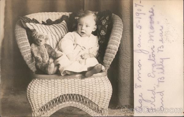 Girl and Teddy Bear in Wicker Chair