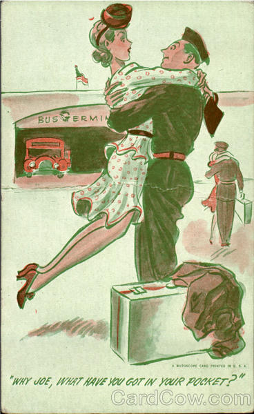 Front: BUS SERMIN A MUTOSCOPE CARD PRINTED IN U. S. A. "WHY JOE, WHAT HAVE YOU GOT IN YOUR POCKET?" Back: POST, ÇARDILY SIDE SIDE A MUTOSCOPE CARD