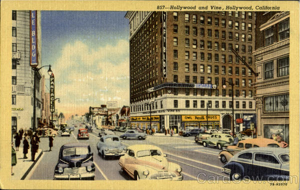 Front: 857-Hollywood and Vine, Hollywood, California OWL Renall RUGS 78-H2070 BLD5 Back: WESTERN PUBLISHING & NOVELTY CO., LOS ANGELES, CALIF. "C.T.ART.COLORTONE'REG.U.S. PAT. OFF.