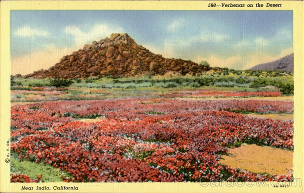 Front: 588-Verbenas on the Desert 4 A-H950 Near Indio, California Ос. т. со. Back: WESTERN PUBLISHING & NOVELTY CO., LOS ANGELES, CALIF. "C.T.ART-COLORTONE' REG. U.S. PAT. OFF.