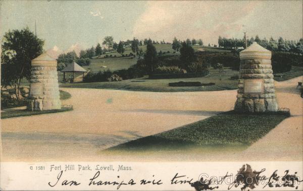 Front: G 1581 Fort Hill Park, Lowell, Mass Iam haniga nire timent ba Back: UNITED STATES OF CHEL A!! NORTH 30 7 AM 1906 1706 FRANKLI 1790 TOSTAGE MASS. The Rotograph Co., N. Y., Çity. (Germany.) WAV Prisa Yannat Jurute C Suvall Wilson 24 Gr nidan