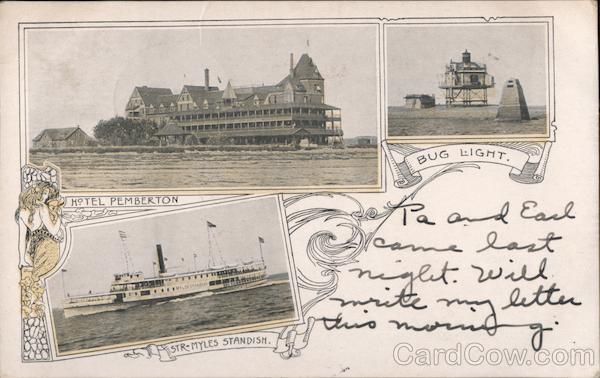 Front: BUG LIGHT. HOTEL PEMBERTON ULE: Ra and Earl come last nighet. will write lette gi SS STANDER This mon ah STROMYLES STANDISH. . Back: UNITED ST. Post Card STACCA 16 9 AM ao 1706 FRANKLIN 1790 ONE CEN 1906 MAS Miss Fanny Sewall Wilton, N.H.