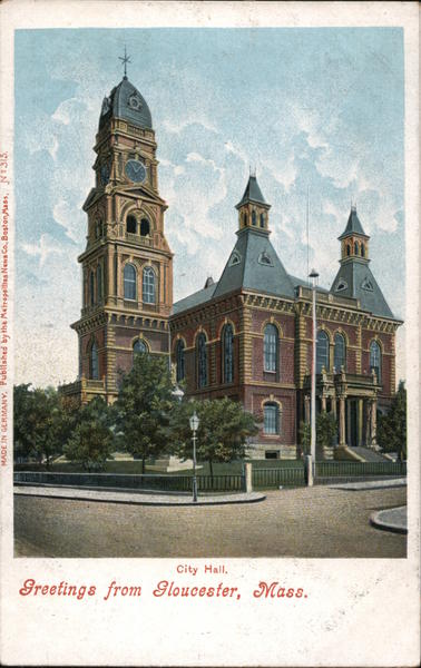 Front: MADE IN GERMANY. Published by the Metropolitan News Co., Boston, Mass. N:315. Greetings from Gloucester, Mass. City Hall. Back: One Cent for United States, and Island Possessions, Cuba, Canada and
