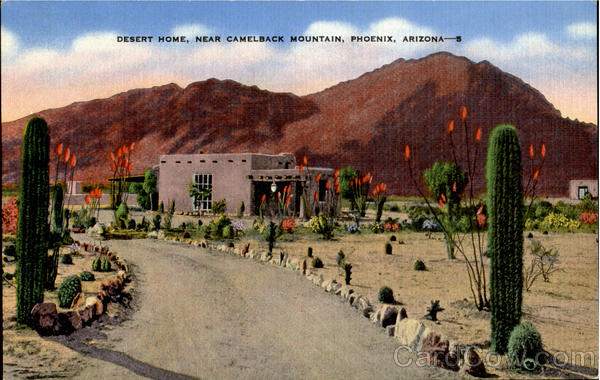 Front: DESERT HOME, NEAR CAMELBACK MOUNTAIN, PHOENIX, ARIZONA 5 Back: 4958N The Arizona Desert is a land of enchantment. Natural surroundings have a lure for many who seek a home on the desert. -PUB CO BY HARRY E. STRONG, PHOENIX ARIZONA-IAJY)