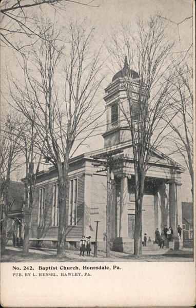 Front: No. 242. Baptist Church, Honesdale, Pa. PUB. BY L. HENSEL, HAWLEY, PA. Back: Postal Card—Carte Postale. PUT A Private Mailing Card. AUTHORIZED BY ACT OF CONGRESS OF MAY 19, 1898. HERE,