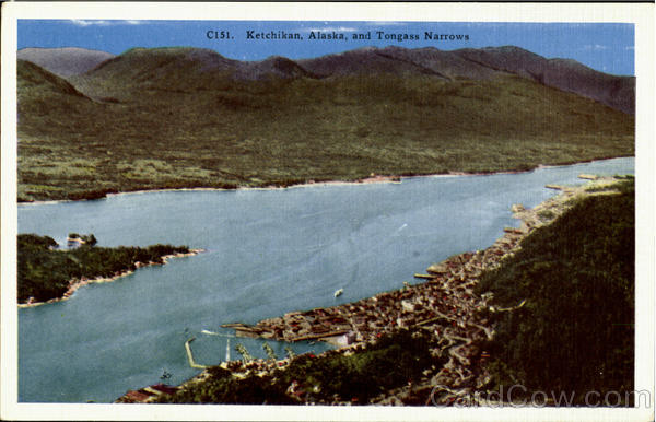 | KETCHIKAN ,Ketchikan is the southernmost town in Alaska and being the port of entry it is sometings spoken of as the "first city" .It is probably the most prosperous town in Alaska , for salmon and halibut have made it rich and given it large canneries and cold storage plants ,. It has a population of about 6,000. |