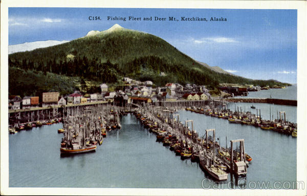 | THE FISHING FLEET. Scenes of this nature are quite common at numerous Alaskan ports. but very rarely does one get a glimpose so many finishing boats at one time .Ketchikan is a popular port of fishermen on accouint of so many oanneries bering located there. It is said that there is more salmpn canned in Ketchikan than in any other oity in the world |