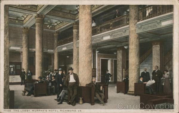 Front: 71168 THE LOBBY, MURPHY'S HOTEL, RICHMOND. VA. COPR. DETROIT PUBLISHING CO. Back: "PHOSTINT TRADE MARK - REG. U. S. PAT. OFF. MADE ONLY BY DETROIT PUBLISHING. CO FOREIGN, TWO THIS SPACE MAY BE USED FOR MESSAGE.