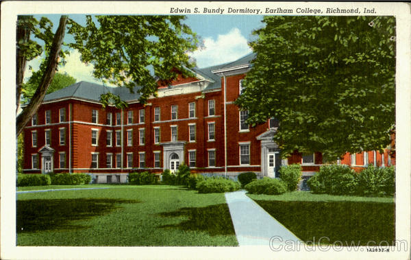 Front: Edwin S. Bundy Dormitory, Earlham College, Richmond, Ind. 1A2837-N Back: ADAM H. BARTEL CO., RICHMOND, IND. Dich pord, bad 443 So IBA 122-144 E. W. Walker IN WASHION