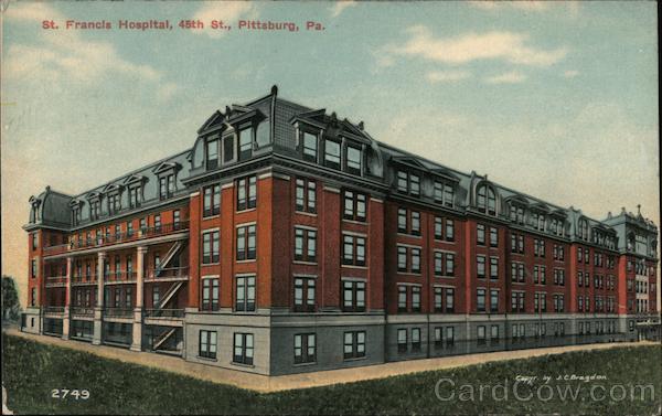 Front: St. Francis Hospital, 45th St., Pittsburg, Pa. 田田 田 Copyr. by J.C.Bragdon. 2749 EFF Back: POST CARD D FOREIGN- THIS SPACE MAY BE USED FOR MESSAGE