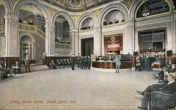 Front: Lobby Hotel Oliver, South Bend, Ind. Back: Publ by Import Post Card Co. Indianapolis, Ind. TRADE Roma MARK Post Ears (55710)
