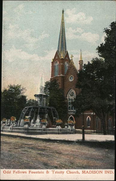 Front: Odd Fellows Fountain & Trinity Church, MADISON IND. DIFR Back: ତି "Elite 2" NO203. H. M. Flora, Dist. , Suhling & Koehn Co., Publ., Chicago, Ill. a Post Card sy ART SERIES