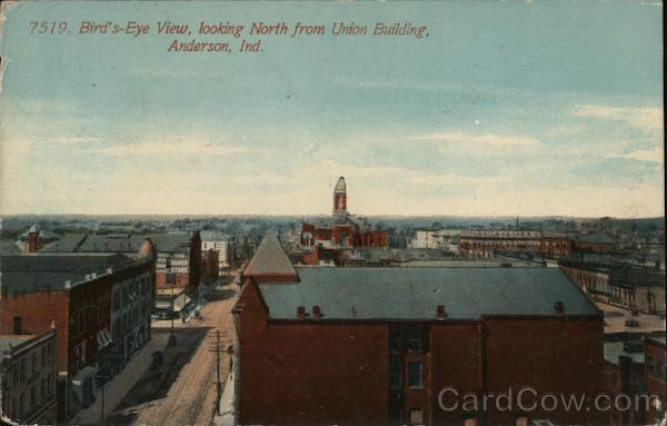 Front: 7519. Bird's-Eye View, looking North from Union Building, Anderson, Ind. 300s THE BANNER TOVES STORE LEGO Back: RE 302 92 AINTES SIDE FOR THE ADDRÉSS. GENT Min Q R Reid 1520 Mich au bh apt to the 10