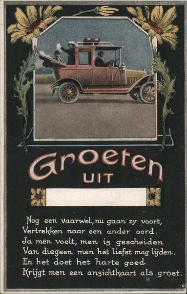 Groefen UIT Nog een vaarwel, nu gaan zy voort, Vertrekken naar een ander oord. Ja mën voelt, men is gescheiden Van diegeen men het liefst mag lijden. En het doet het harte goed Krijgt men een ansichtkaart als groet.