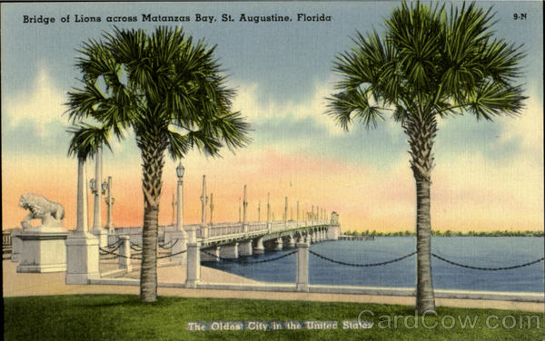 | THE BEAUTIFUL NEW BRIDGE OF LIONS WAS COMPLETED BY THE PEOPLE OF ST. AUGUSTINE AT A COST OF A MILLION DOLLARS ON APRIL 27th 1927. IT IS THE CONNECTING LINK BETWEEN THIS AGE-GOLD CITY OF ANASTASIA ISLAND AND ST.AUGUSTINE BEACH THE FINEST IN THE WORLD |