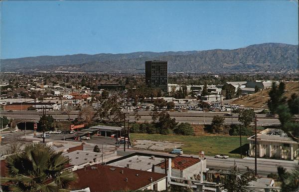 | From the Hollywood Hills this view looks towards Universal City. In the foreground is the Hollywood Freeway running through Cahuenga Pass-the most heavily traveled pass in the world. At the foot of the San Gabriel Mountains in the background are Burbank, and to the left, Glendale. |