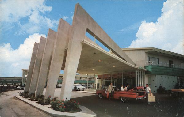 This dramatic entrance leads you into an attractive motor hotel that is also a unique convention center with huge underground exhibit hall and auditorium. Comfortable, TV-furnished rooms, large warm-weather swimming pool, colorful Crossroads Restaurant. |