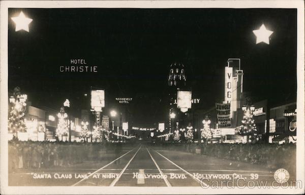 Front: CHRISTIE ROOSEVELT NEY TUNGLE PRINCESS DAG BODKS CANTOR A TAB Cors Eddie COROTHY LAMOUR RAY NLLARD MAVY OLDE-gO* "SANTA CLAUS LANE AT NIGHT HOLLYWOOD BLVD. HOLLYWOOD, CAL. 39 UPPTI Back: 12 - EN ni