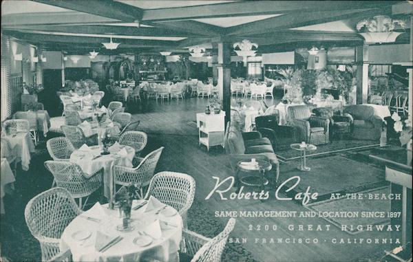 Front: Roberis Roberts Cafe AT THE BE ACH SAME MANAGEMENT AND LOCATION SINCE 1897 2 200 GREAT HIGHWAY SAN FRANCISCO CALIFORNIA Back: Roberts Mailing Card AT . THE ยท BEACH SINCE 1897 2. )