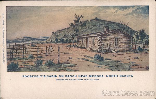 AVAupert. ROOSEVELT'S CABIN ON RANCH NEAR MEDORA, NORTH DAKOTA WHERE HE LIVED FROM 1883 TO 1886 Copyrighted 1905, by Porte Printing Co., Fargo, N. D.
