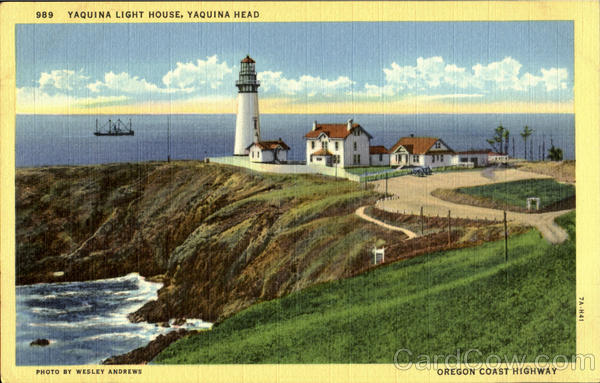 Front: 989 YAQUINA LIGHT HOUSE, YAQUINA HEAD PYA. PHOTO BY WESLEY ANDREWS OREGON COAST HIGHWAY 7A-H41 Back: "C.T. ART-COLORTONE'REG.U.S. PAT. OFF.-WESLEY ANDREWS CO., PORTLAND, ORE.