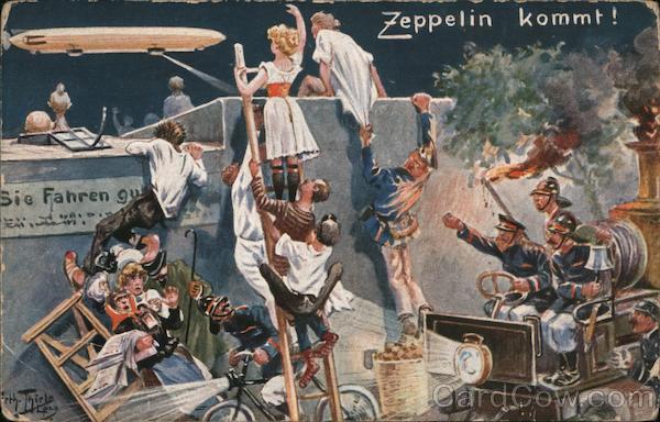 Front: Zeppelin kommt! Bie Fahren 9 FTthhicle Back: lan Vierfarbendruck-Clichés von Adolf Klauss & Co., Leipzig. Jurer Machen Verlag F. Eyfriedt, Düsseldorf 21. Serie 388.