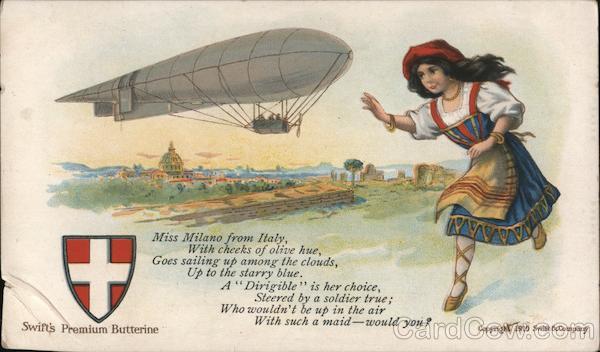 Swift's Premium Butterine - Miss Milano from Italy, with cheeks of olive hue, goes sailing up among the clouds, up to the starry blue. A "Dirigible" is her choice, steered by a soldier true; Who wouldn't be up in the air with such a maid-would you? copyright 1919 swift & company From the Darlene Thorne Collection |