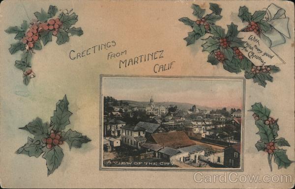 Front: With Rvery good for Christmas MARTINEZ CREETINGS CALIF AVIE W OF THE CIT Back: DOMESTIC, shapy py nene year Published by Richard Behrendt, San Francisco, Cal. to you all from your Unel Inity Haerly.