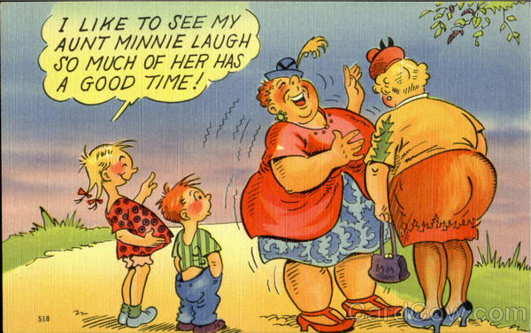 Front: I LIKE TO SEE MY AUNT MINNIE LAUGH SO MUCH OF HER HAS A GOOD TIME! in 518 Back: "TICHNOR QUALITY VIEWS" REG. U. S. PAT. OFF. MADE ONLY BY TICHNOR BROS., INC., BOSTON, MASS, 75795