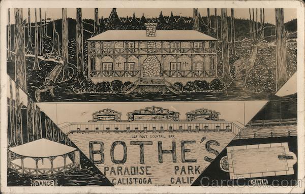 Front: 125 FOOT COCKTAIL BAR BOTHES PARADISE CALISTOGA PARK CALIF DANCE SWIM O BOTHES 1439 PO MENRY Back: "P NARA COUNTY 8500
