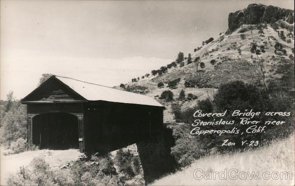 Front: Covered Bridge across Stanislaus Pirer near Capperopolis,Colif. Zan Y-23 Back: 1963 3.00 POSI Card CORRESTONDENCD AT O'BRYNE'S FERRY 6 ML. FROM COPPER OPOLIS NOW GONE - DAM&TULLOCK RESEVGIR COVER SITE.