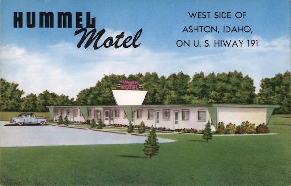 17,116F HUMMEL MOTEL MODERN ROOMS ELECTRIC HEAT KITCHENETTES AVAILABLE PHONE 155-ASHTON, IDAHO PLACE STAMP HERE Post Card Pub. by H. O.Schilling, Butte, Montana