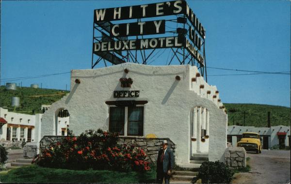 Charlie White, founder of White's City, standing in front of the office of White's City De Luxe Motel, at the entrance to Carlsbad Caverns National Park, White's City, New Mexico, situated in southeastern New Mexico. The Carlsbad Caverns are open every day in the year. Hemler Post Card Co. |