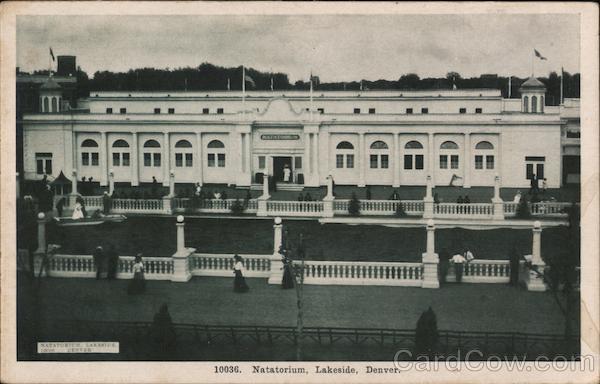 Front: CLATATORU NATATORI , LAKESIDE DENVER 10036. Natatorium, Lakeside, Denver. Back: POST ARD THIS SPACE CAN BE USED FOR A WRITTEN MESSAGE, USING ONE-CENT STAMP